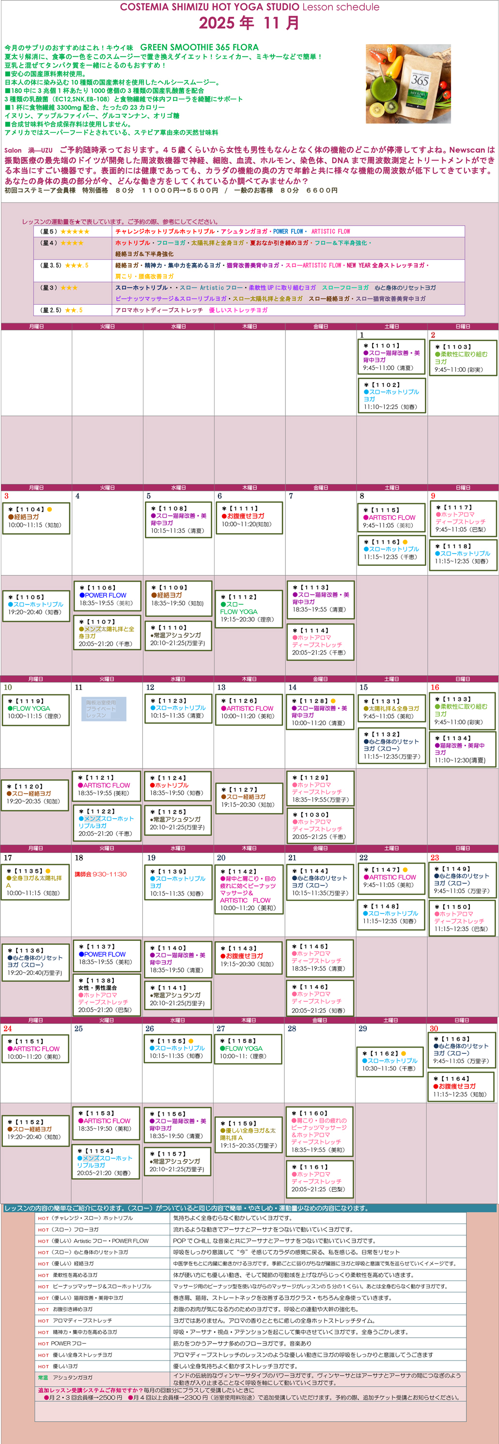 COSTEMIA清水スタジオ11月のヨガレッスンスケジュール
