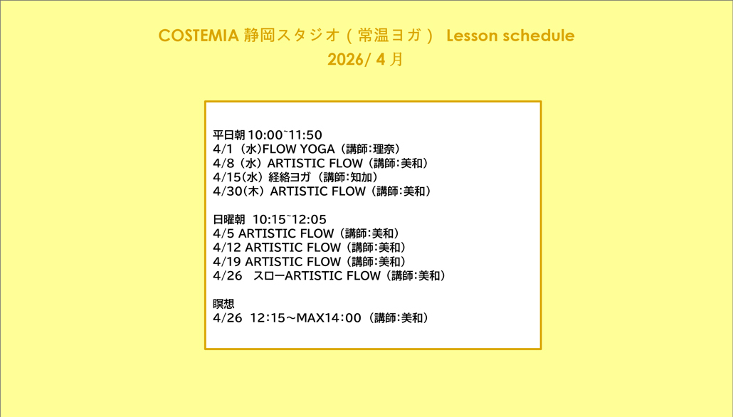COSTEMIA静岡スタジオ4月のヨガレッスンスケジュール
