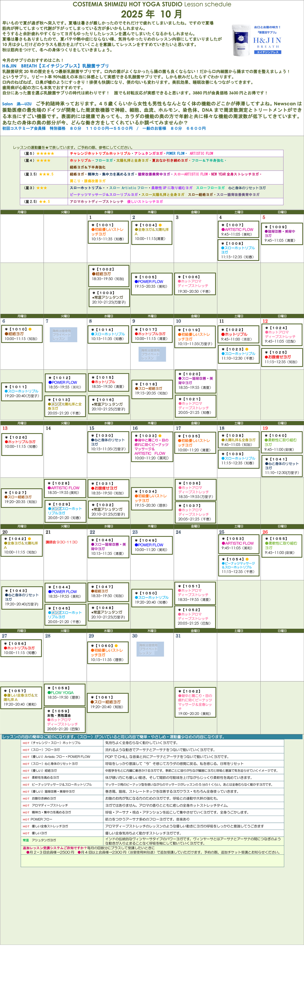 COSTEMIA清水スタジオ10月のヨガレッスンスケジュール
