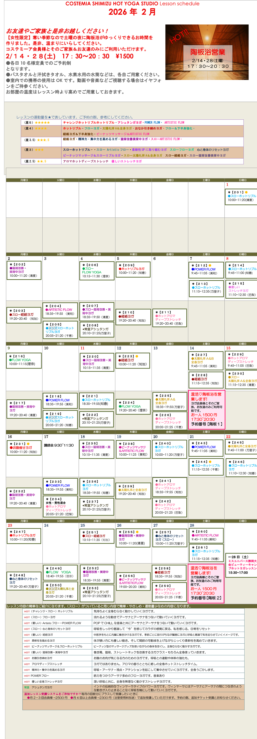 COSTEMIA清水スタジオ2026年2月のヨガレッスンスケジュール