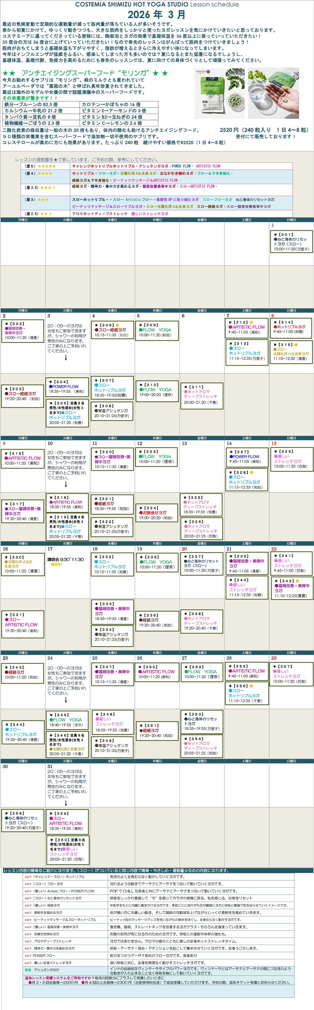 COSTEMIA清水スタジオ3月のヨガレッスンスケジュール