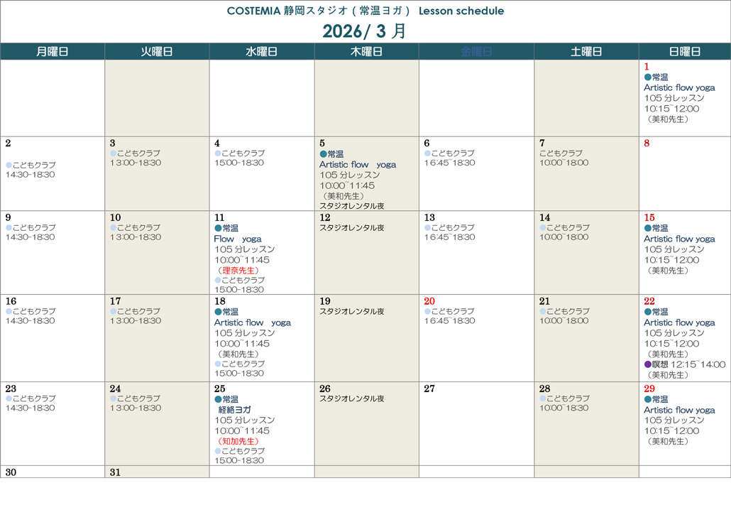 COSTEMIA静岡スタジオ3月のヨガレッスンスケジュール